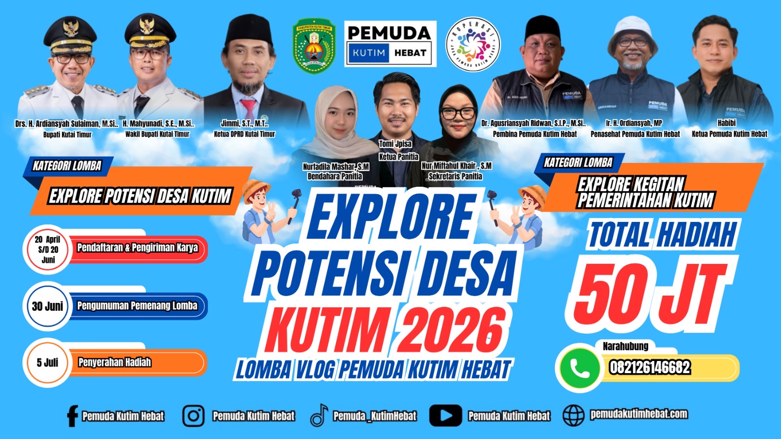 “Peserta cukup membuat vlog mode portrait maksimal 5 menit, lalu diunggah ke Instagram, Facebook, dan TikTok. Jangan lupa gunakan hashtag #ExplorePotensiDesaKutim2026 dan #PemudaKutimHebat serta tag akun terkait,” jelasnya.