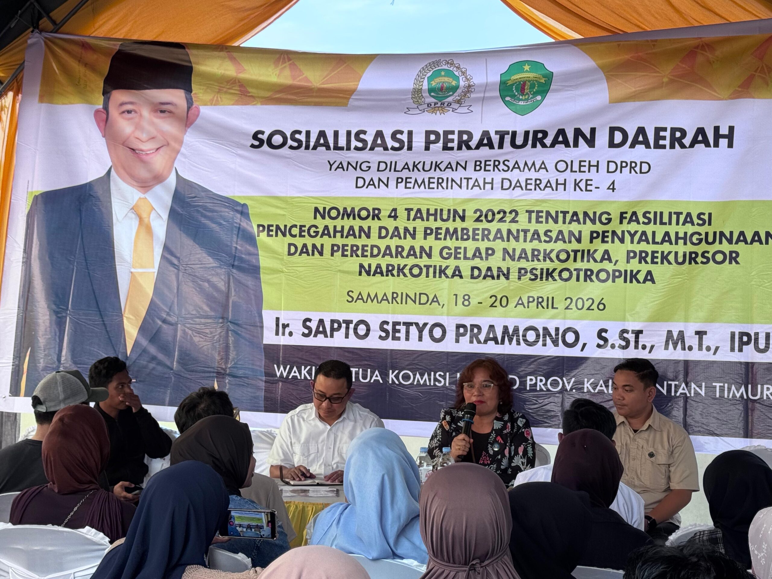 Ideanews.co, Samarinda – Anggota DPRD Kalimantan Timur, Ir. Sapto Setyo Pramono, S.ST., MT., IPU, menggelar kegiatan Sosialisasi Peraturan Daerah (Sosper) Nomor 4 Tahun 2022 tentang Fasilitasi Pencegahan dan Pemberantasan Penyalahgunaan serta Peredaran Gelap Narkotika, Prekursor Narkotika, dan Psikotropika. Minggu, (19/04/2026).